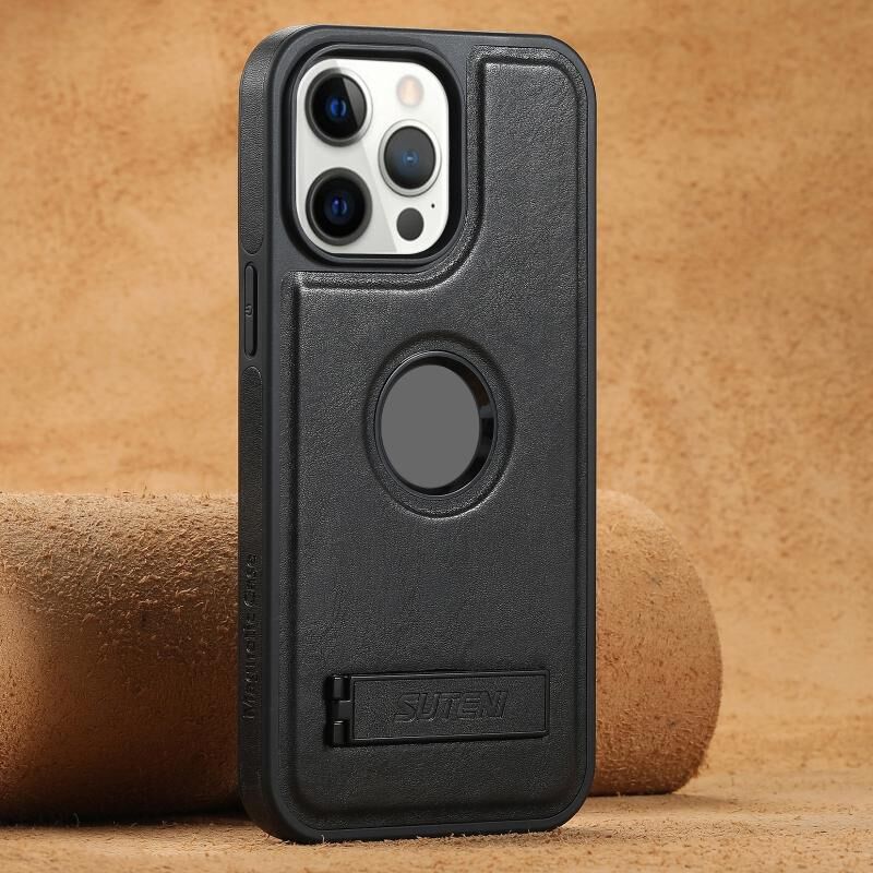 Θήκη τηλεφώνου Suteni G2 Magsafe για iPhone 12 Pro με δέρμα καλυμμένο με κερί λαδιού και βάση στήριξης (Μαύρο) (Suteni)