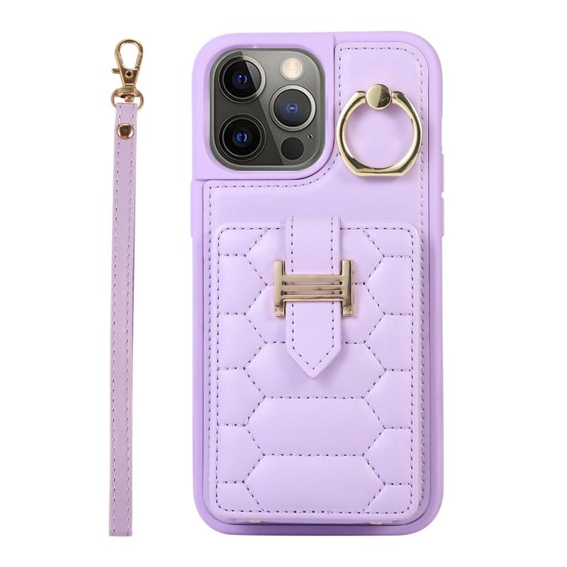For iPhone 12 Pro Vertical Card Bag Ring Holder Phone Case with Dual Lanyard(Purple)