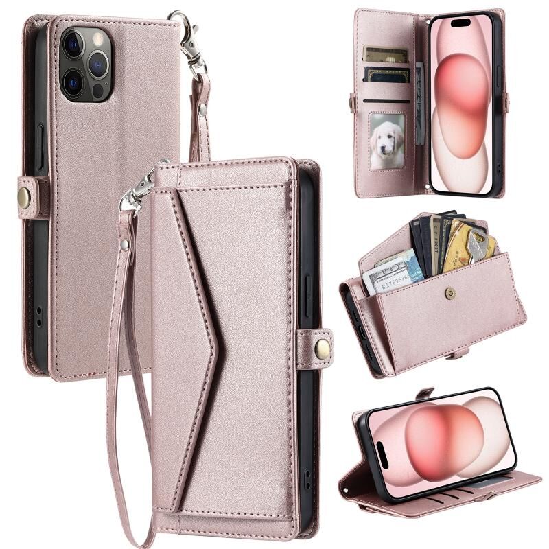 For iPhone 12 Pro Wallet Multi-card Slot Leather Phone Case with Lanyard(Rose Gold)