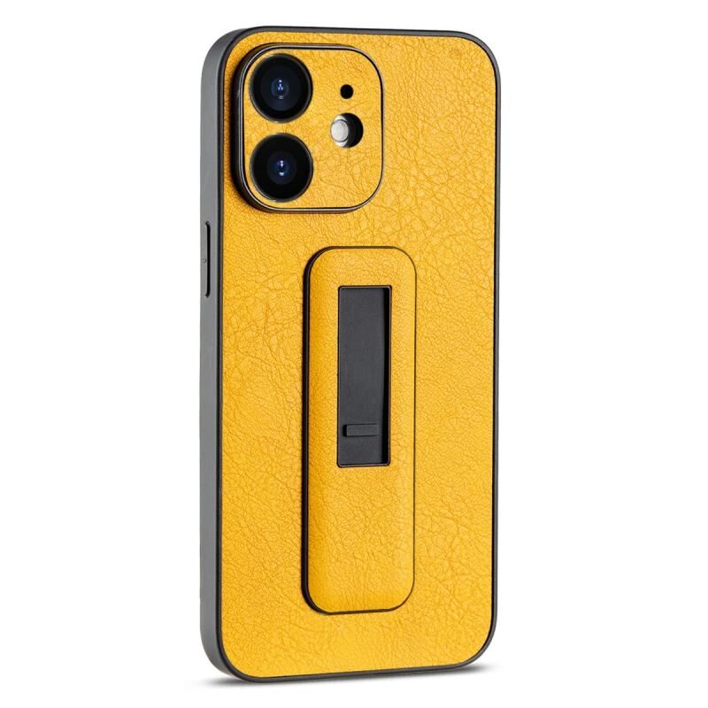 For iPhone 12 PU Leather Push-pull Bracket Shockproof Phone Case(Yellow)