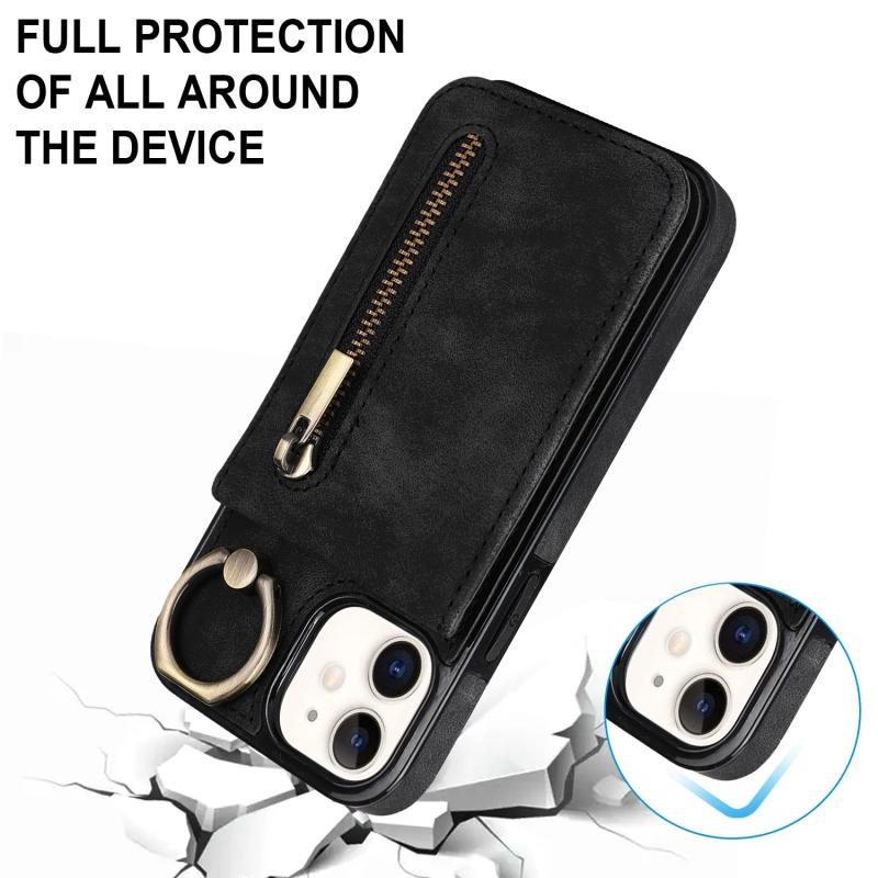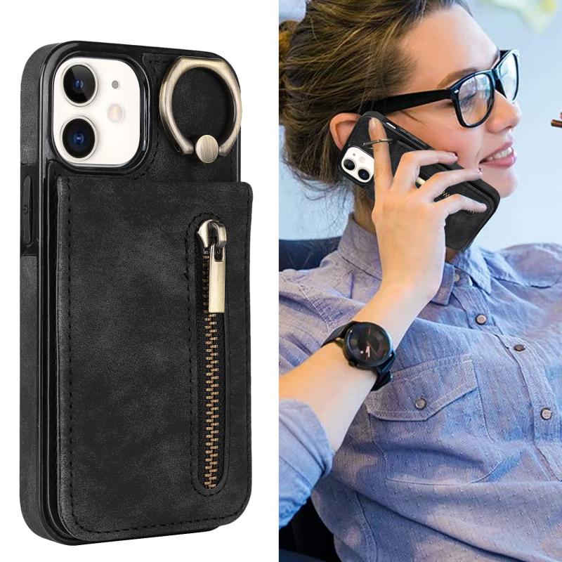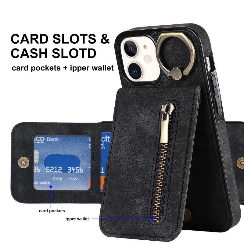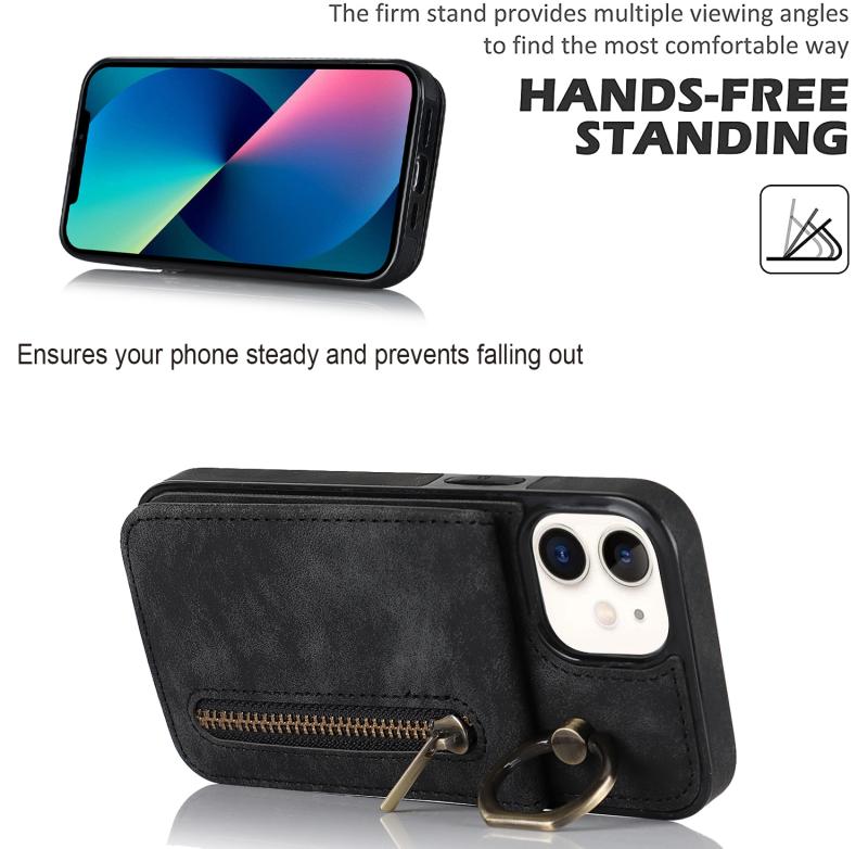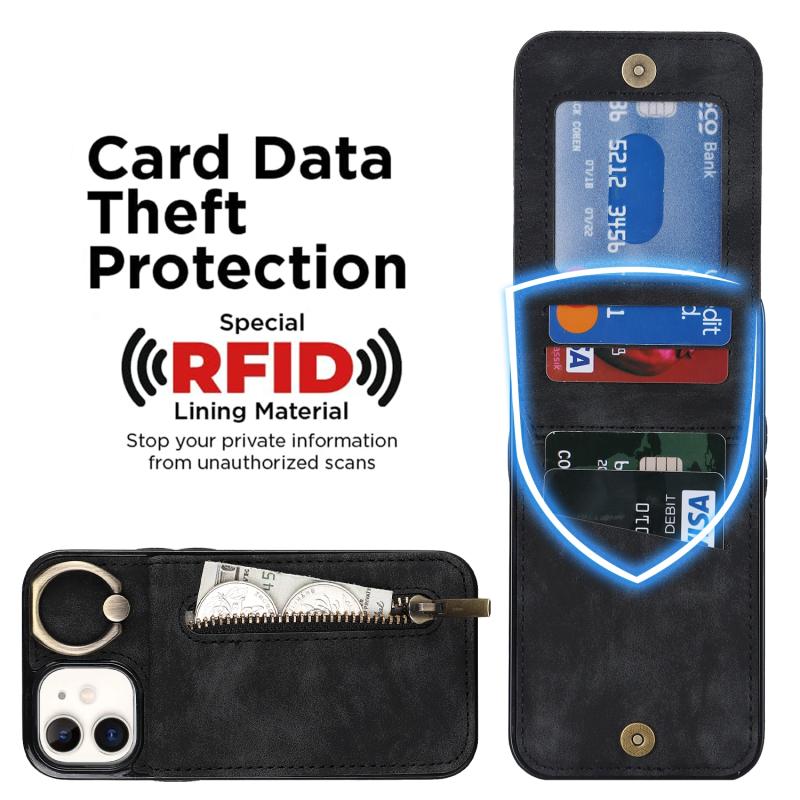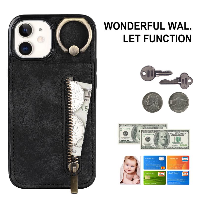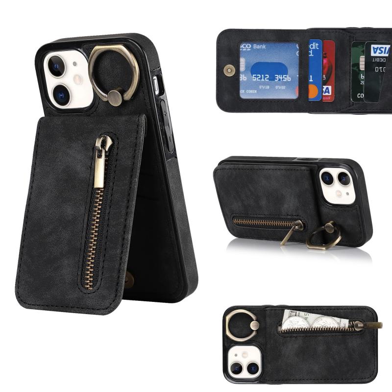 For iPhone 12 Retro Ring and Zipper RFID Card Slot Phone Case(Black)