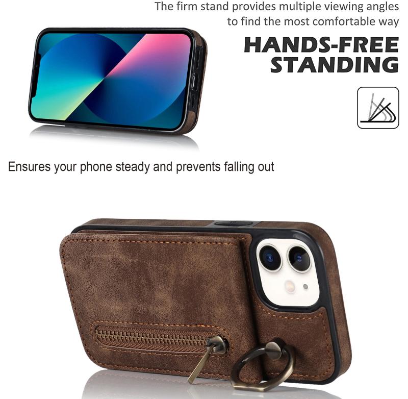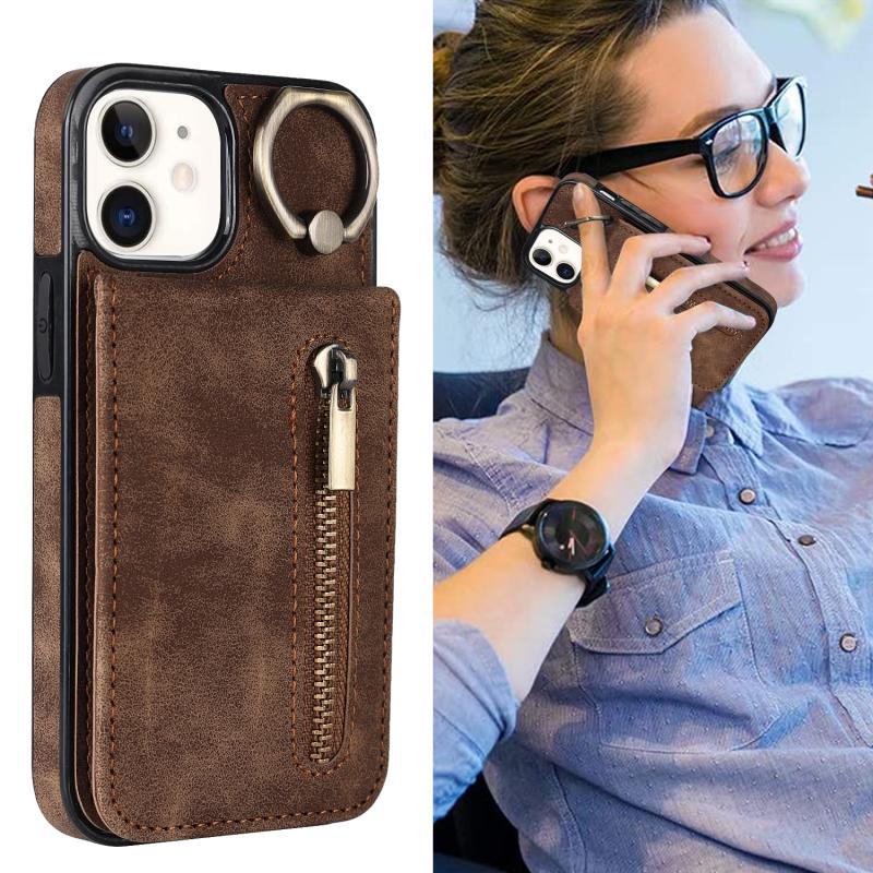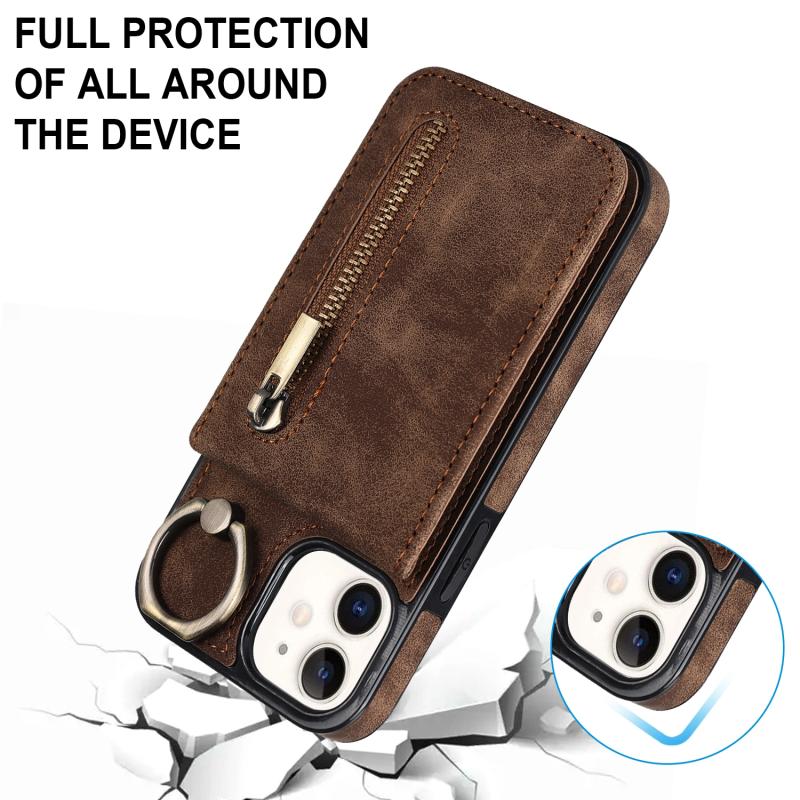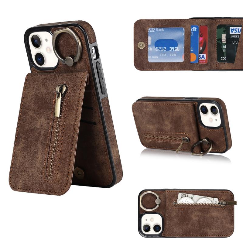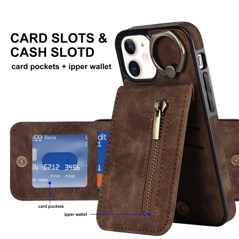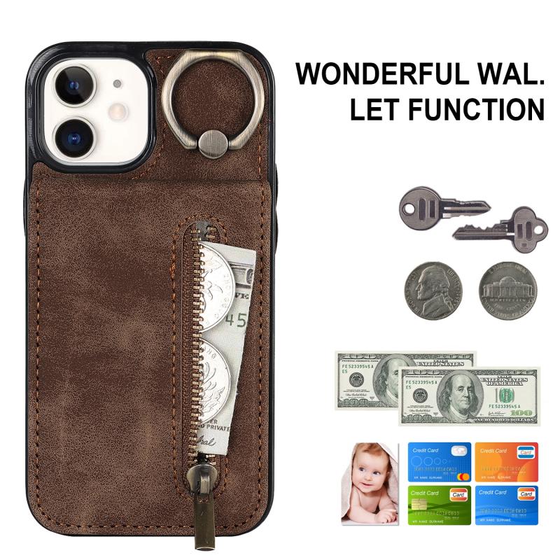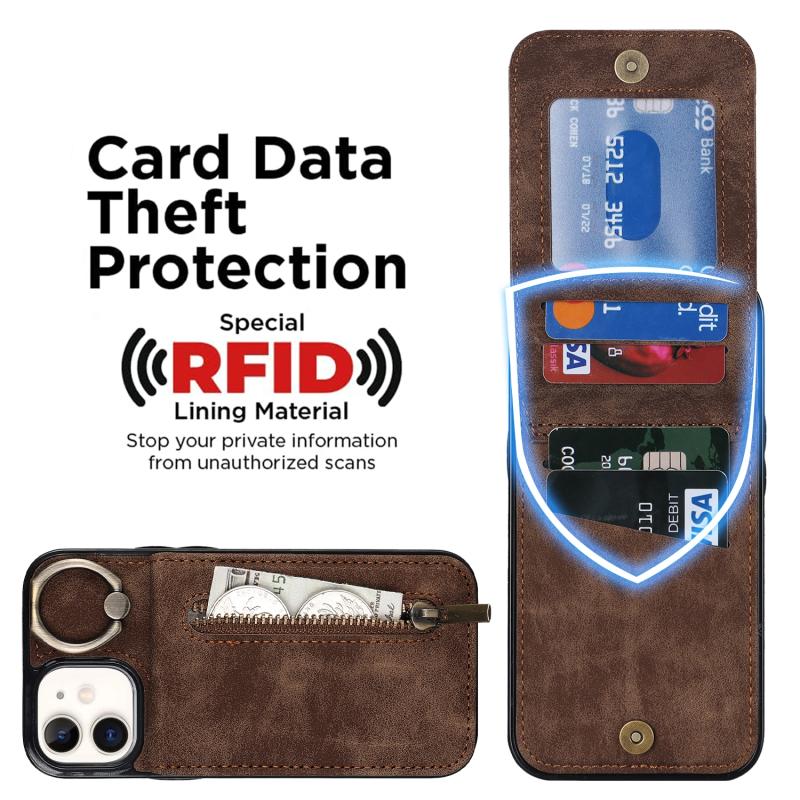 For iPhone 12 Retro Ring and Zipper RFID Card Slot Phone Case(Brown)