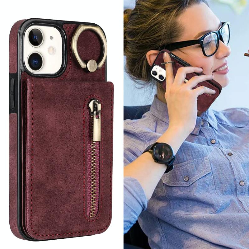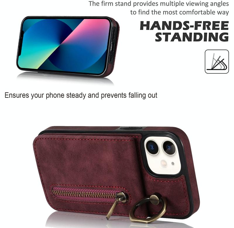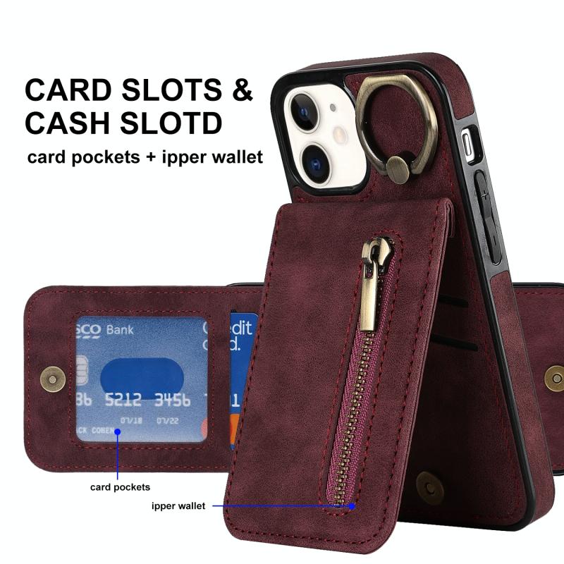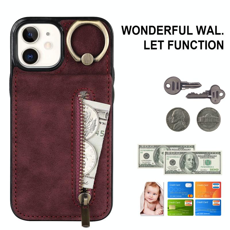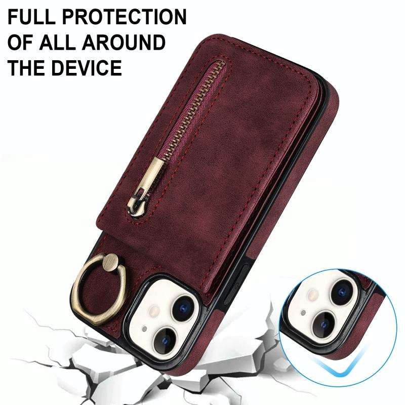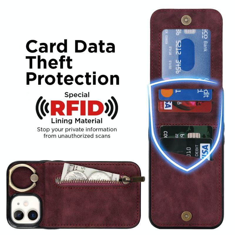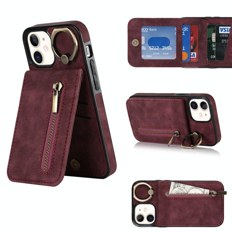 For iPhone 12 Retro Ring and Zipper RFID Card Slot Phone Case(Wine Red)