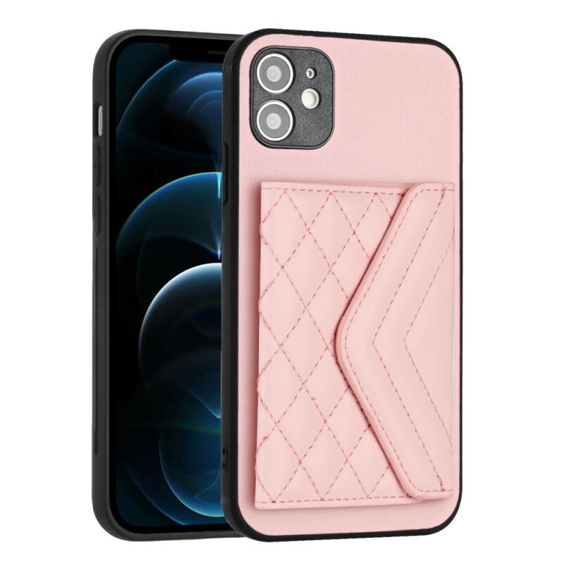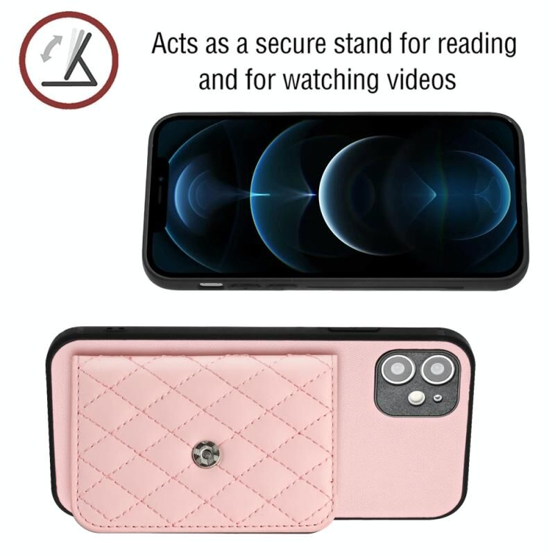 For iPhone 12 Rhombic Texture Card Bag RFID Phone Case with Long Lanyard(Rose Gold)