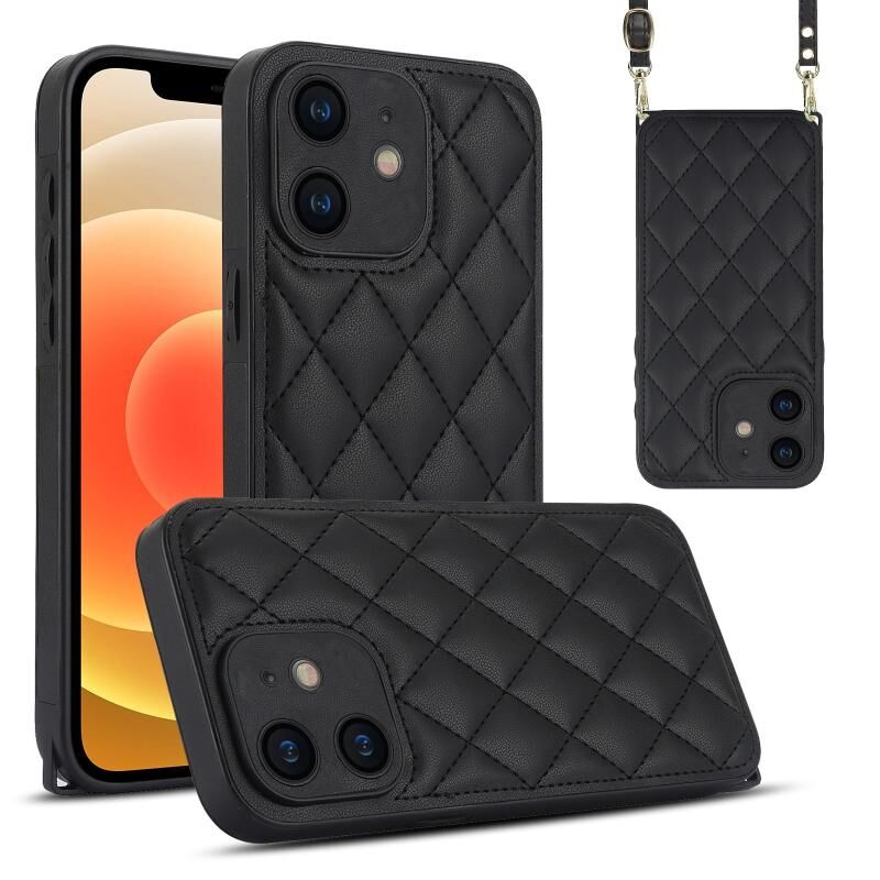For iPhone 12 Rhombic Texture Phone Case with Dual Lanyard(Black)