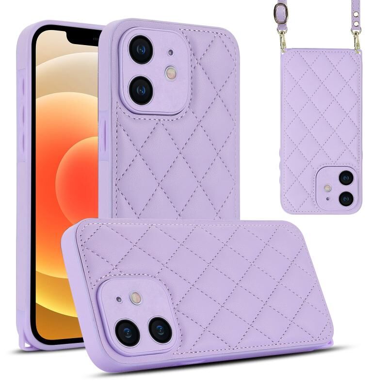 For iPhone 12 Rhombic Texture Phone Case with Dual Lanyard(Purple)