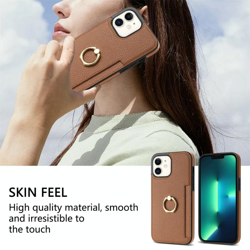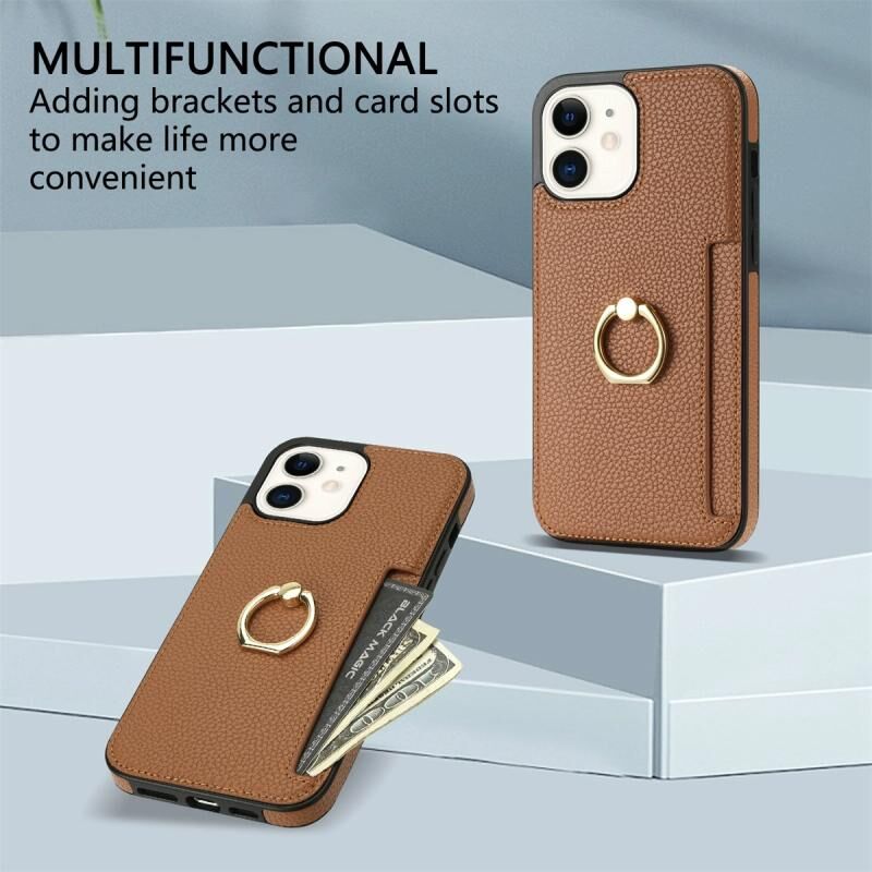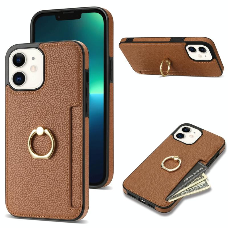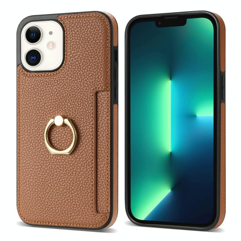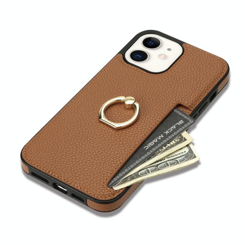 For iPhone 12 Ring Card Litchi Leather Back Phone Case(Brown)