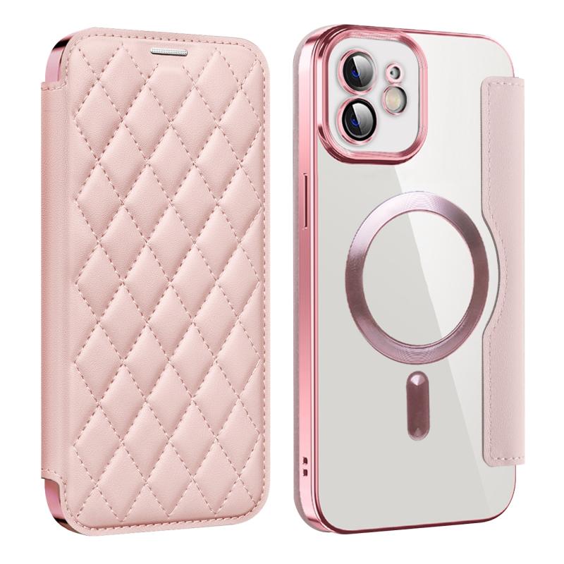 For iPhone 12 Shield Magsafe RFID Anti-theft Rhombus Leather Phone Case(Pink)