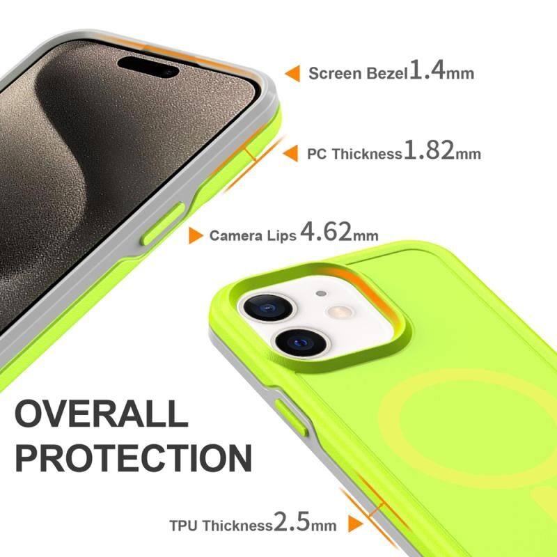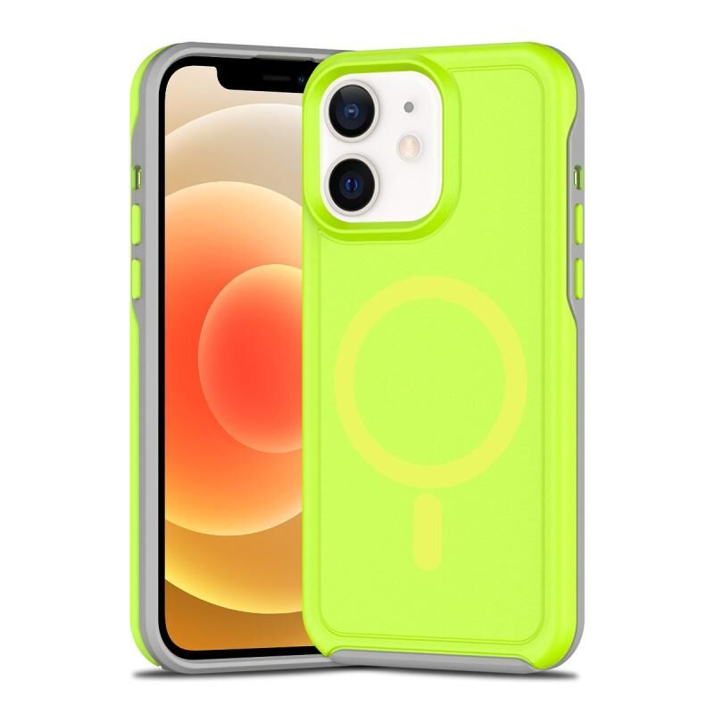 For iPhone 12 Shockproof MagSafe Armor PC Hybrid TPU Phone Case(Fluorescent Green+Gray)