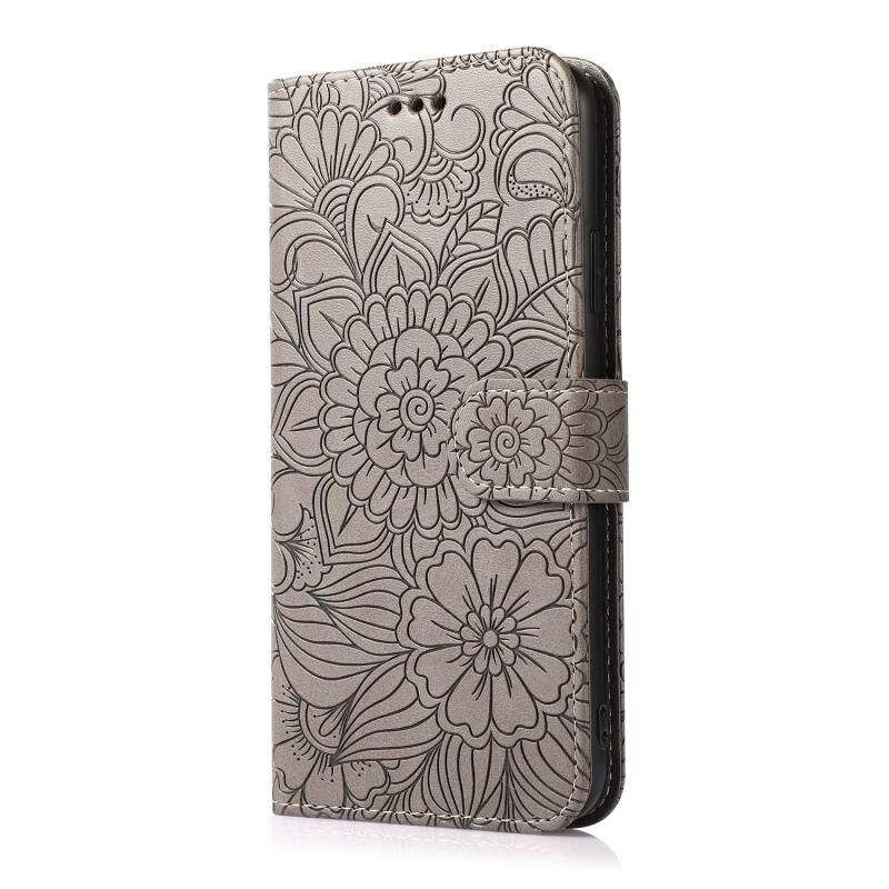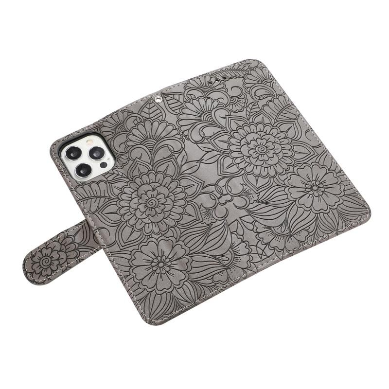 Θήκη δέρματος οριζόντιας αναδίπλωσης για iPhone 12 με υφή δέρματος, ανάγλυφο ηλίανθο, με βάση & υποδοχές καρτών & πορτοφόλι & κορδόνι (Μωβ)