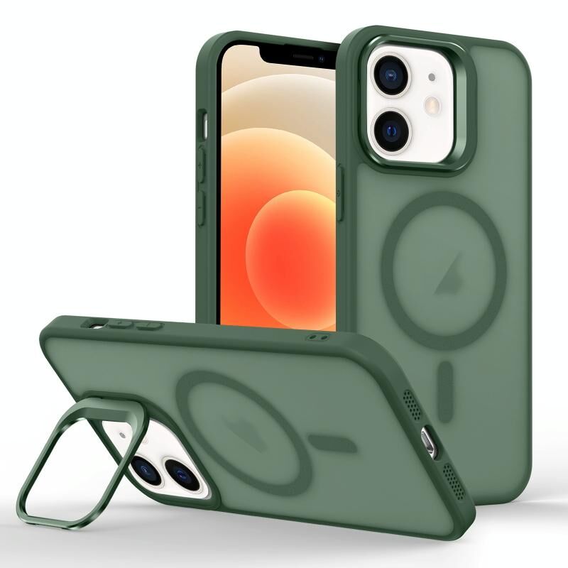 For iPhone 12 Skin Feel Lens Holder Magsafe Phone Case(Deep Green)
