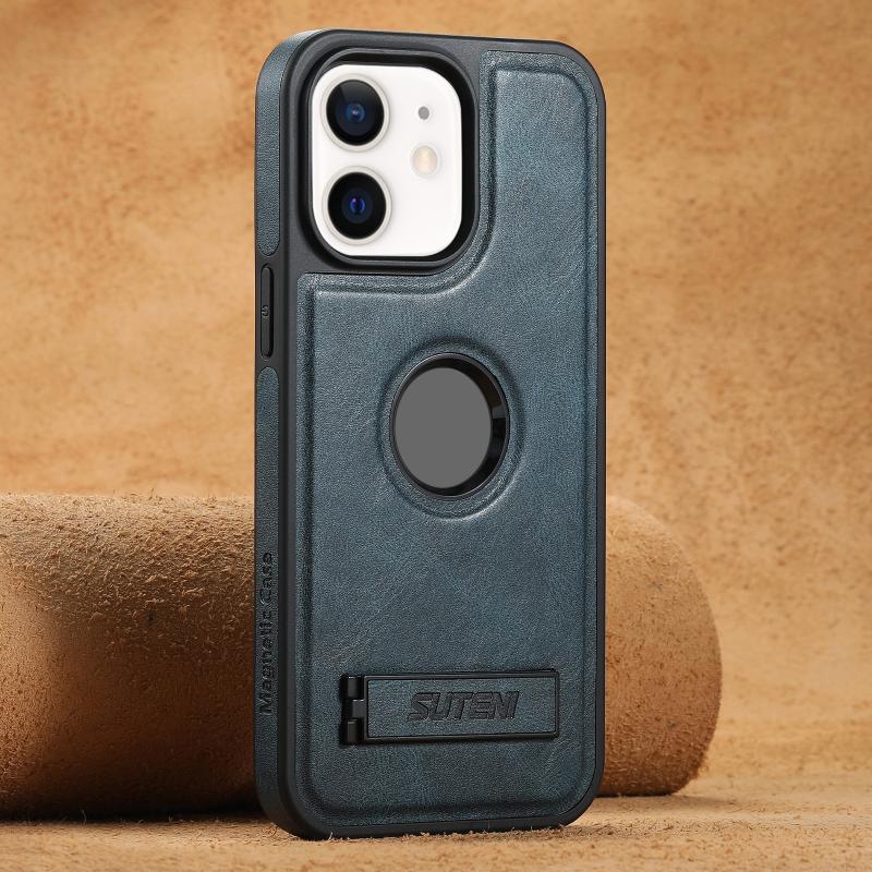 For iPhone 12 Suteni G2 Magsafe Oil Wax Leather Back Phone Case with Holder(Blue) (Suteni)
