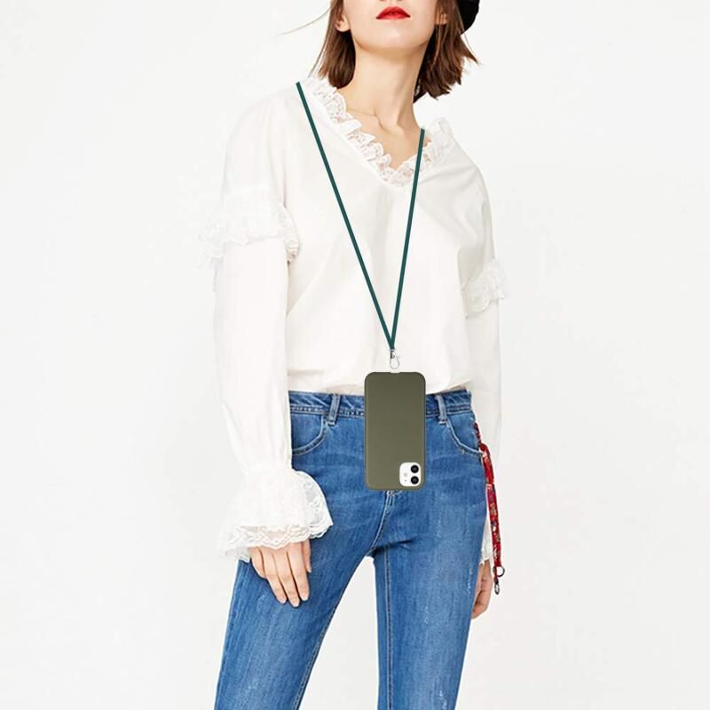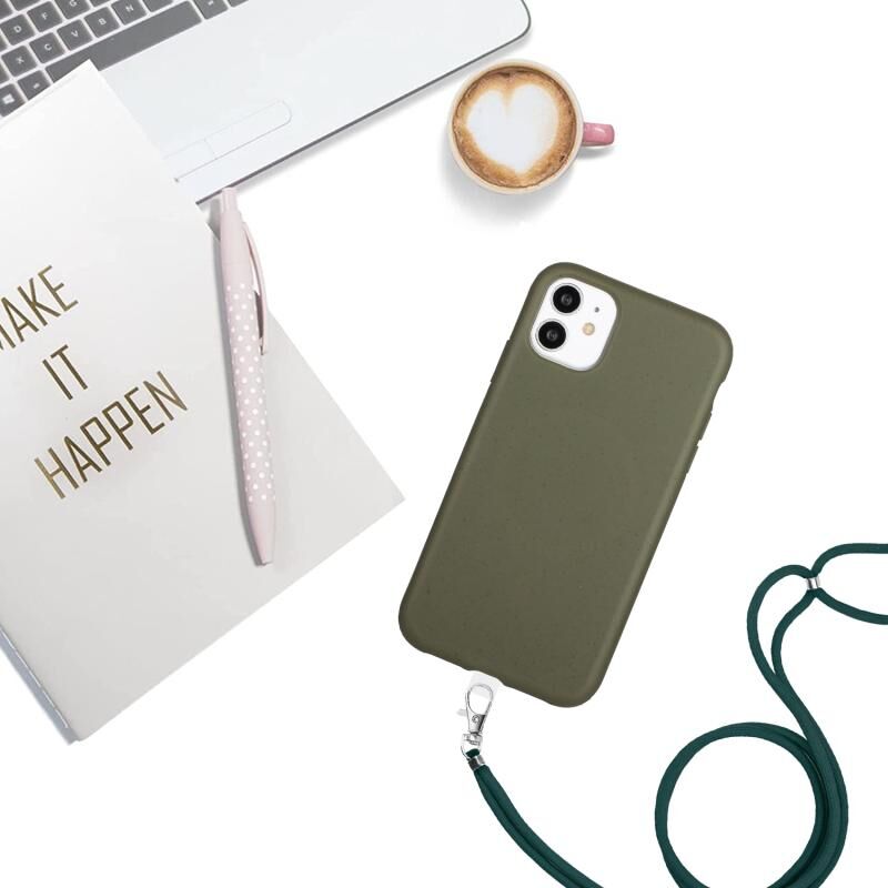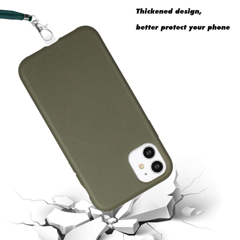 For iPhone 12 Wheat MagSafe Magnetic Straw Material + TPU Phone Case with Lanyard(Army Green)