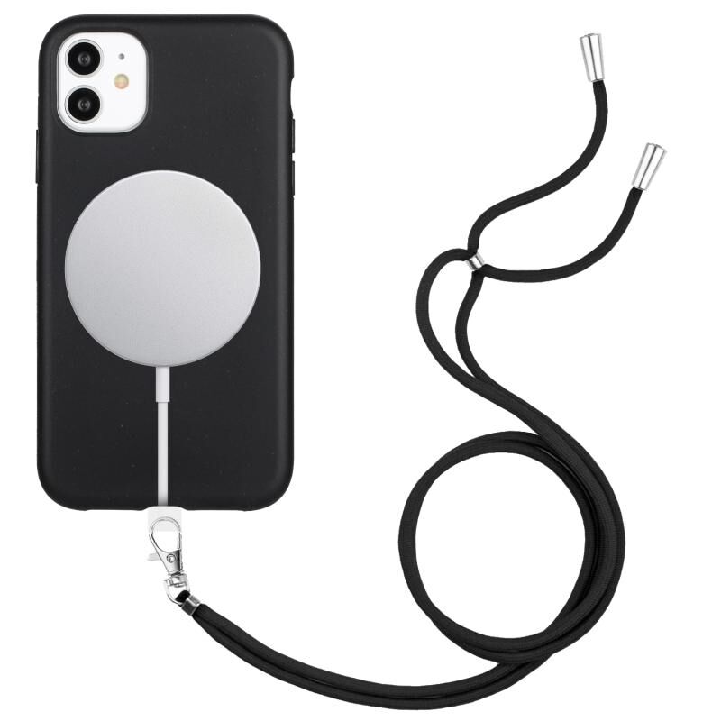 For iPhone 12 Wheat MagSafe Magnetic Straw Material + TPU Phone Case with Lanyard(Black)