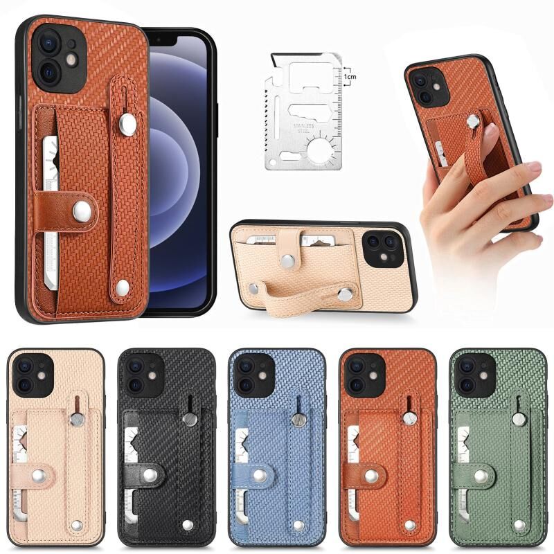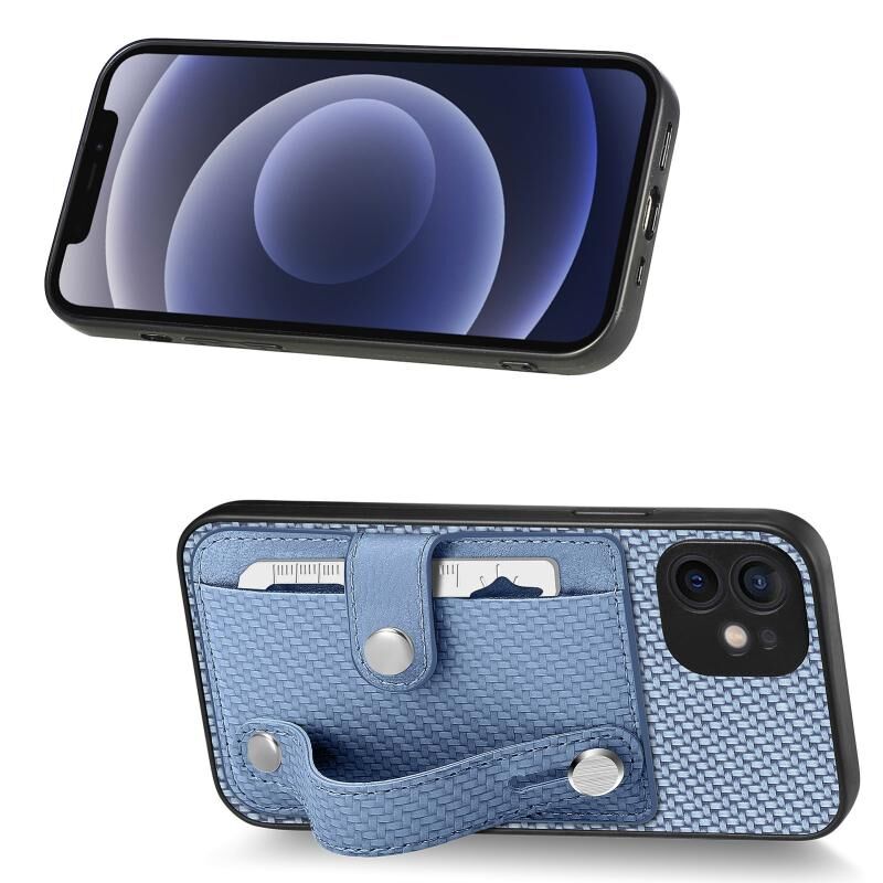 For iPhone 12 Wristband Kickstand Card Wallet Back Cover Phone Case with Tool Knife(Blue)