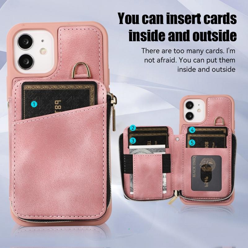 For iPhone 12 Zipper Card Bag Back Cover Phone Case(Pink)