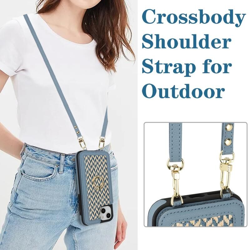Θήκη τηλεφώνου πλήρους κάλυψης με διπλή πόρπη για κάρτες και λουρί crossbody για iPhone 13 / 14 (Μπλε)