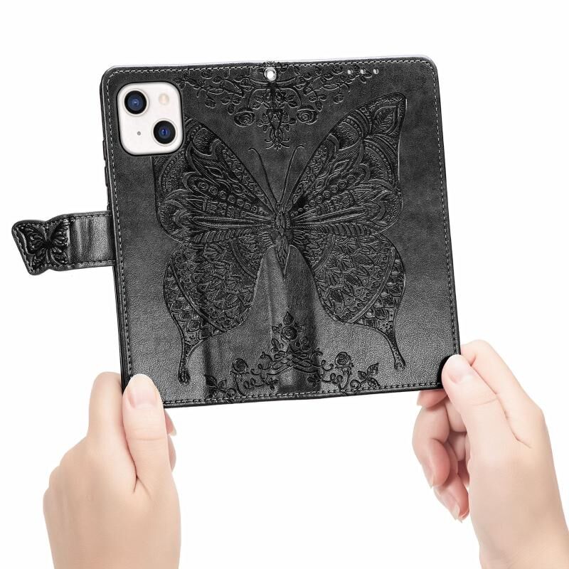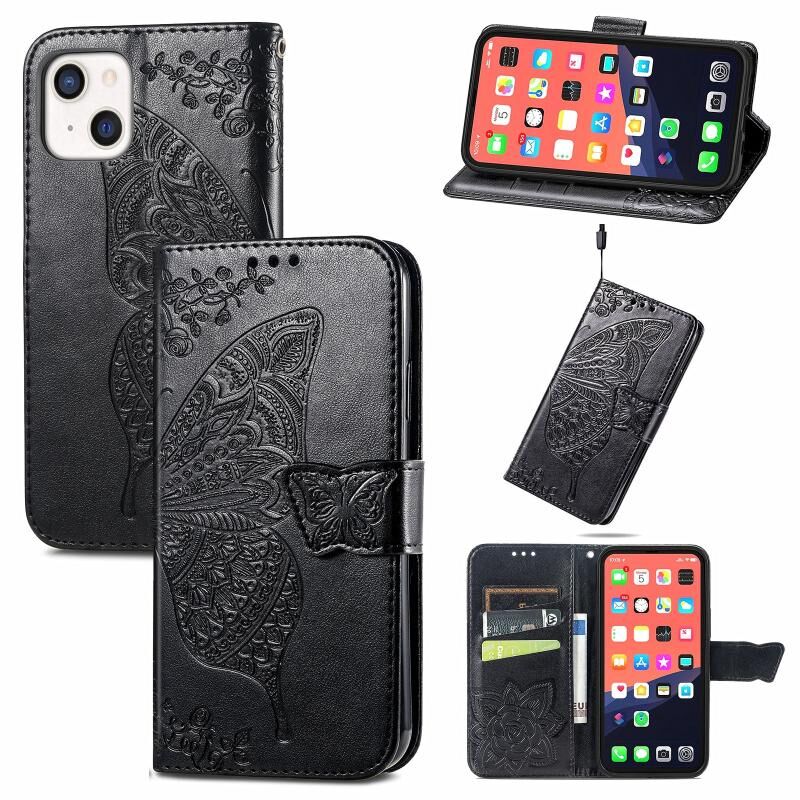 Θήκη για iPhone 13, Δερμάτινη οριζόντια με μαγνητικό κλείσιμο, με σχέδιο πεταλούδας και λουλουδιών, με βάση στήριξης / θήκη για κάρτες / πορτοφόλι / κορδόνι (Μαύρο)