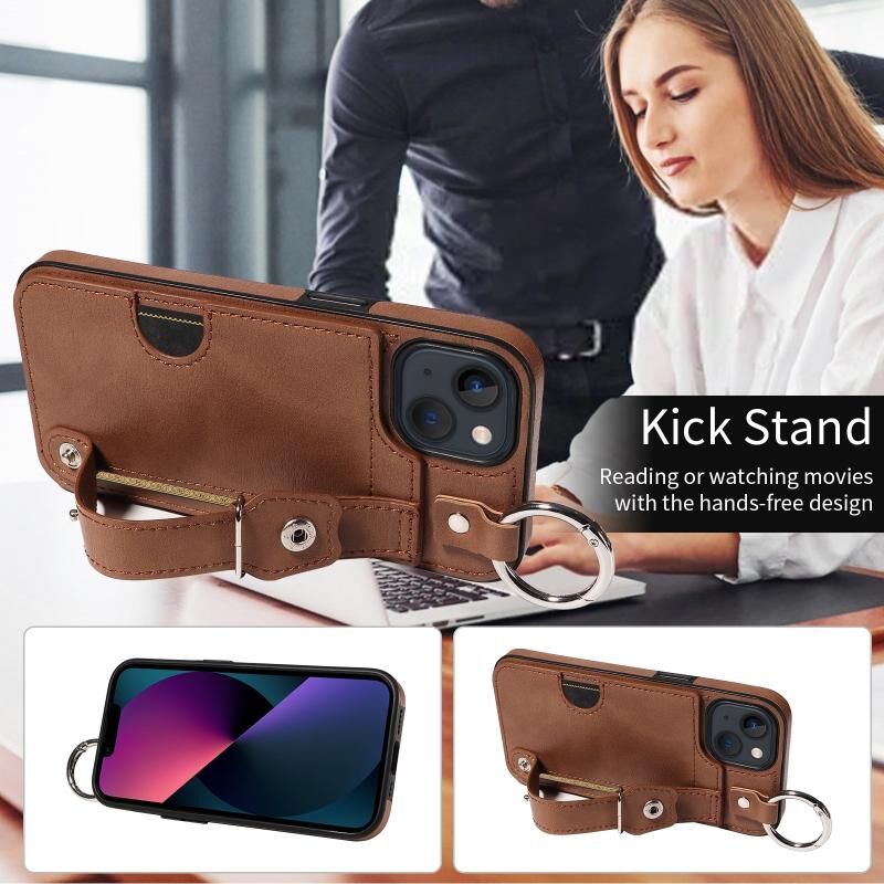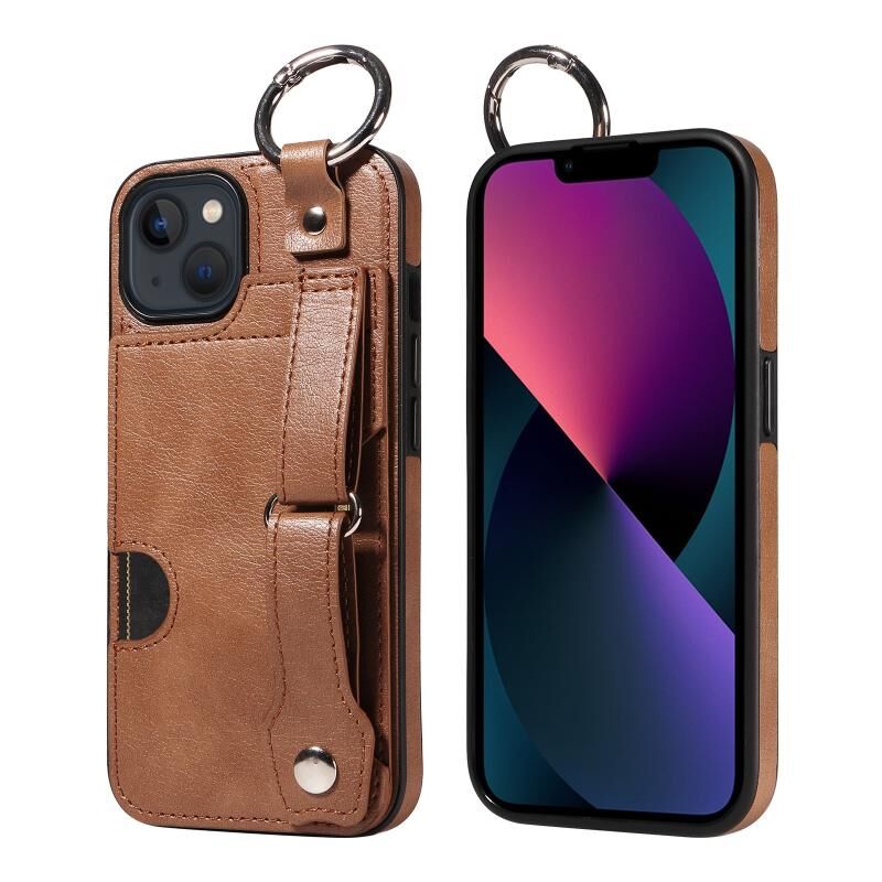 For iPhone 13 Calf Texture Wrist Card Slot Ring Phone Case(Brown)