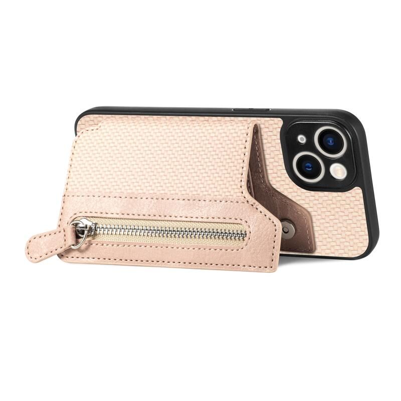 For iPhone 13 Carbon Fiber Horizontal Flip Zipper Wallet Phone Case(Khaki)
