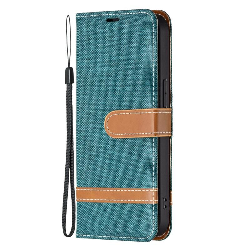 Θήκη για iPhone 13 με υφή τζιν, οριζόντια, αναδιπλούμενη από δέρμα, σε μοβ χρώμα, με βάση στήριξης, θήκες για κάρτες, πορτοφόλι και κορδόνι.