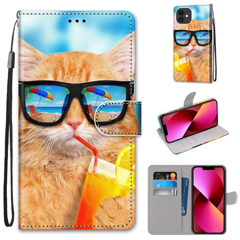 Θήκη για iPhone 13 με πολύχρωμο σχέδιο, υφή σταυρού, οριζόντια αναδίπλωση από δερματίνη PU με βάση & θήκες για κάρτες & πορτοφόλι & κορδόνι (Γάτα που πίνει αναψυκτικό)