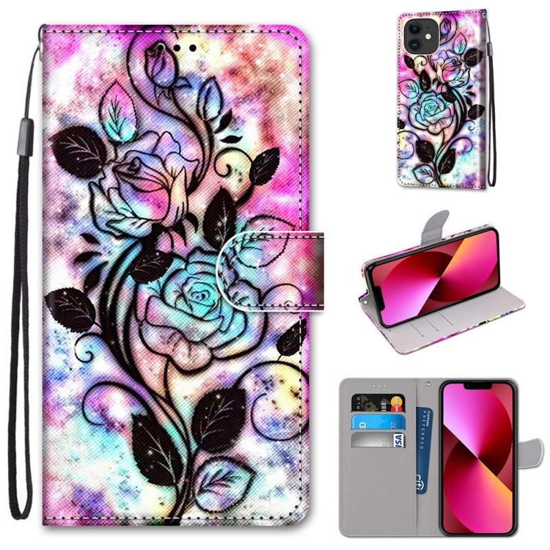 Θήκη για iPhone 13 με πολύχρωμο σχέδιο, υφή σταυρού, οριζόντια αναδίπλωση από δερματίνη PU με βάση & θήκες για κάρτες & πορτοφόλι & κορδόνι (Ροζ Λουλούδι, Γέφυρα του Πύργου)