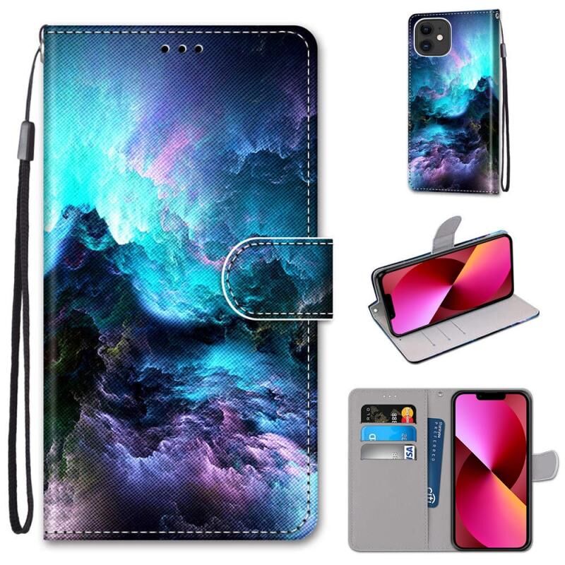 Θήκη για iPhone 13 με πολύχρωμο σχέδιο, υφή σταυρού, οριζόντιο άνοιγμα, από δερματίνη PU με βάση & θήκες για κάρτες & πορτοφόλι & κορδόνι (Πολύχρωμα Σύννεφα)
