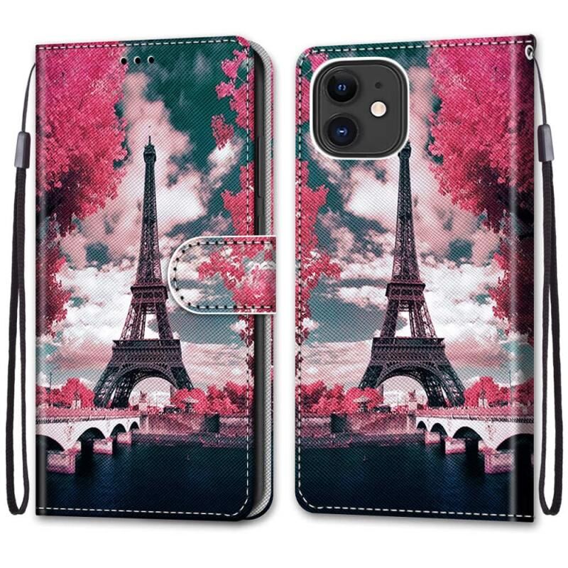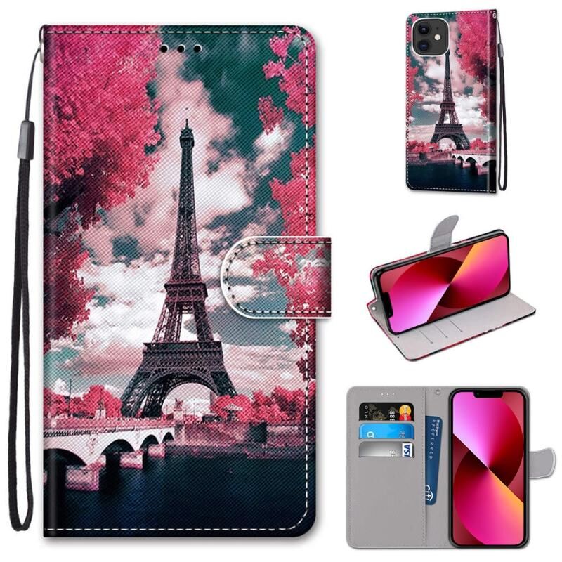 Θήκη για iPhone 13 με πολύχρωμο σχέδιο, υφή σταυρού, οριζόντια αναδίπλωση από δερματίνη PU με βάση & θήκες για κάρτες & πορτοφόλι & κορδόνι (Ροζ Λουλούδι, Γέφυρα του Πύργου)