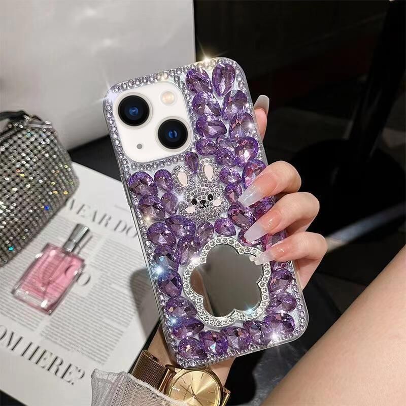 For iPhone 13 Diamond Mirror Rabbit Handmade PC Phone Case(Purple Flower Mirror)