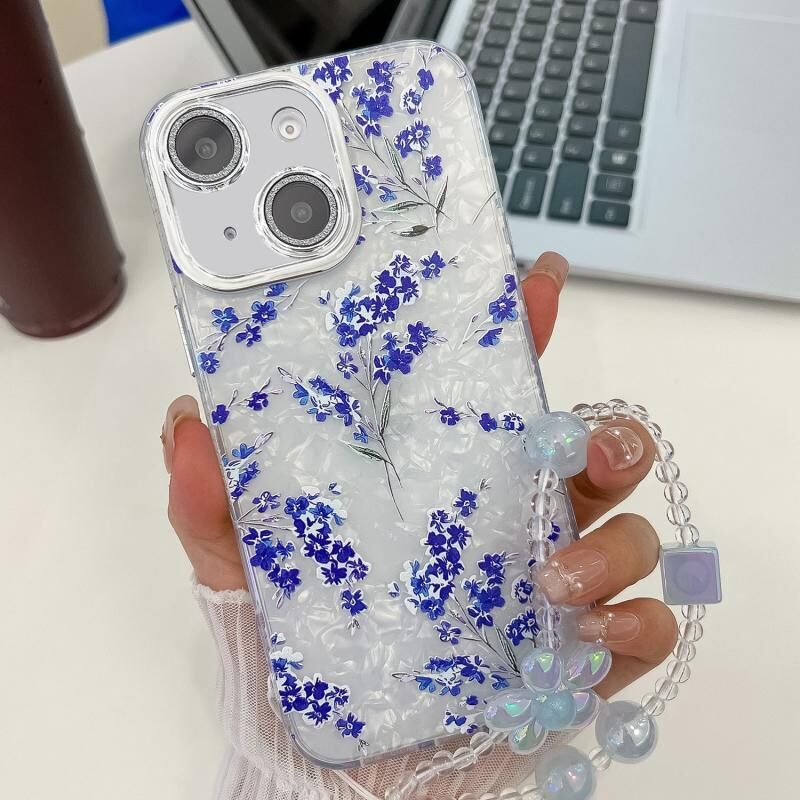 For iPhone 13 Electroplating Flowers Plants Texture Wristband TPU Phone Case(Blue Flower FL13)