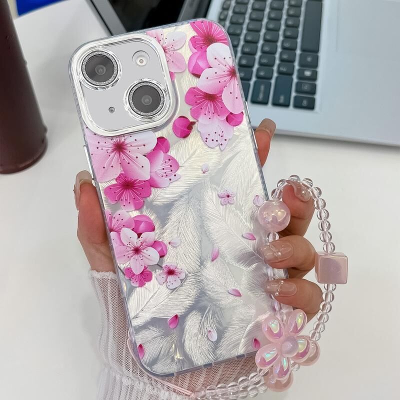 For iPhone 13 Electroplating Flowers Plants Texture Wristband TPU Phone Case(Peach Blossom FL18)