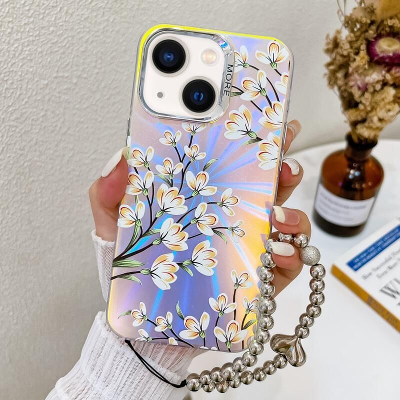 Θήκη τηλεφώνου με ηλεκτρολυτική επίστρωση και λουλούδι λέιζερ για iPhone 13 με λουρί καρπού (Λουλούδι αχλαδιού AH17)
