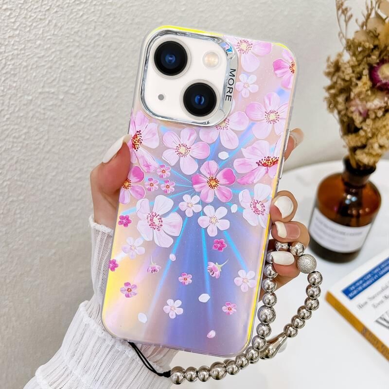 Θήκη τηλεφώνου με ηλεκτρολυτική επίστρωση και λουλούδι λέιζερ για iPhone 13 με λουρί καρπού (Λευκό Λουλούδι AH10)