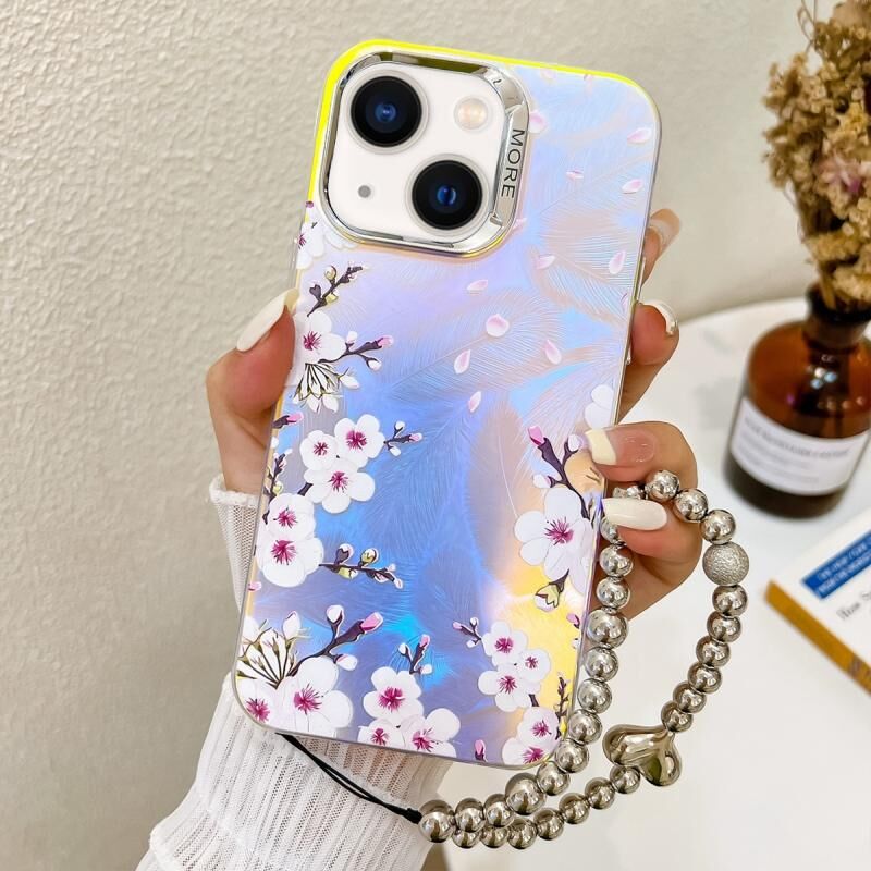 Θήκη τηλεφώνου με ηλεκτρολυτική επίστρωση και σχέδιο λουλουδιού με λέιζερ για iPhone 13 με λουρί καρπού (Δαμασκηνιά AH18)