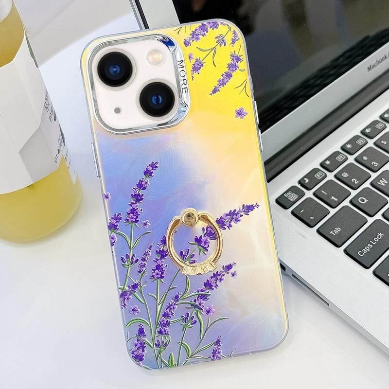 For iPhone 13 Electroplating Laser Flower Ring Holder TPU Phone Case(Lavender AH14)