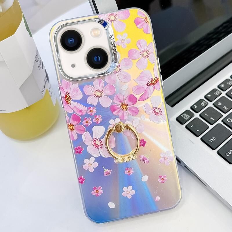 For iPhone 13 Electroplating Laser Flower Ring Holder TPU Phone Case(Pink Flower AH13)