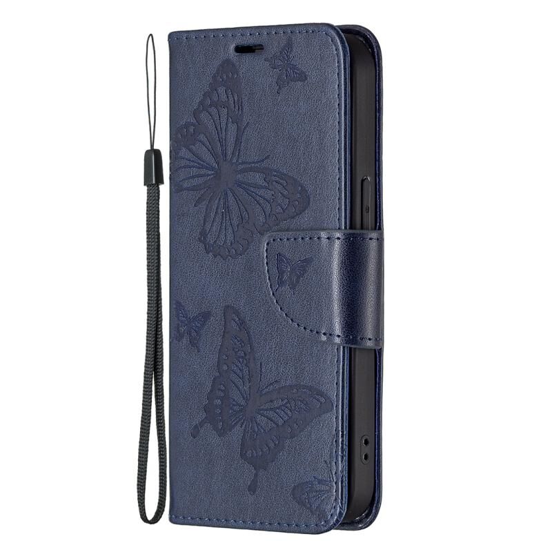 Θήκη για iPhone 13 με ανάγλυφο σχέδιο δύο πεταλούδων, οριζόντια, από δερματίνη PU με βάση στήριξης, θήκη για κάρτες, πορτοφόλι & λουρί (Γκρι)