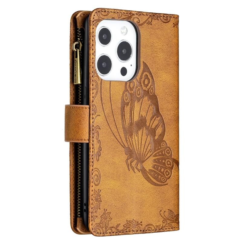 For iPhone 13 Flying Butterfly Embossing Pattern Zipper Horizontal Flip Leather Case with Holder & Card Slots & Wallet(Brown)