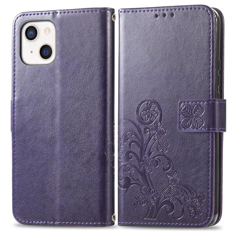 Θήκη δερμάτινη για iPhone 13 με σχέδιο τριφυλλιού, ανάγλυφο κούμπωμα, προστασία κινητού, λουρί, θήκη για κάρτες, πορτοφόλι και λειτουργία βάσης (Χρυσό ροζ)