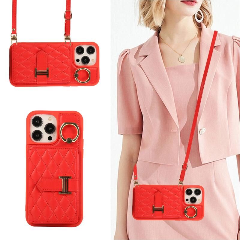 For iPhone 13 Horizontal Card Bag Ring Holder Phone Case with Dual Lanyard(Red)