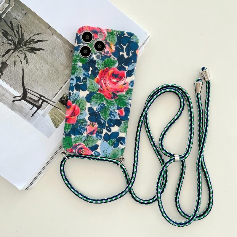 For iPhone 13 Lanyard Small Floral TPU Phone Case(Green)