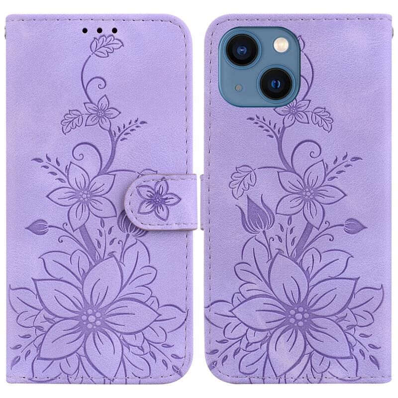For iPhone 13 Lily Embossed Leather Phone Case(Purple)