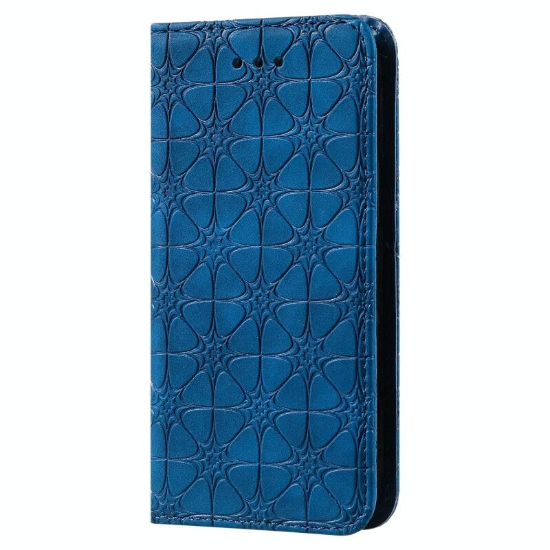 For iPhone 13 Lucky Flowers Embossing Pattern Magnetic Horizontal Flip Leather Case with Holder & Card Slots(Dark Blue)