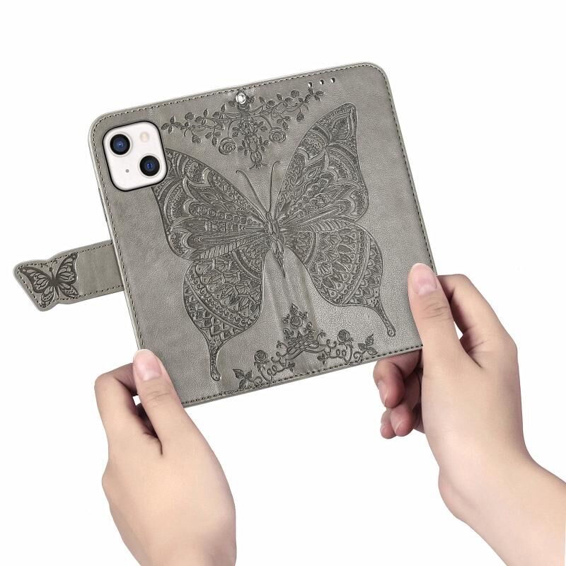 Θήκη για iPhone 13 mini, με σχέδιο πεταλούδας και λουλουδιών, ανάγλυφη, οριζόντια, από δέρμα με βάση / υποδοχή κάρτας / πορτοφόλι / κορδόνι (Ροζ)