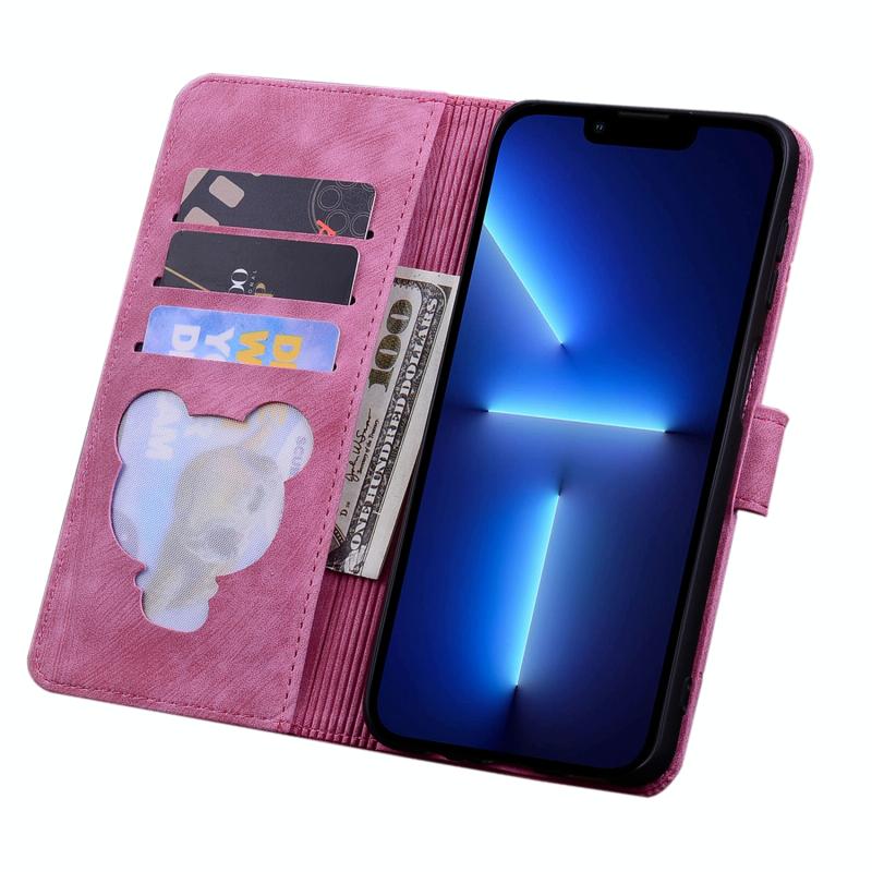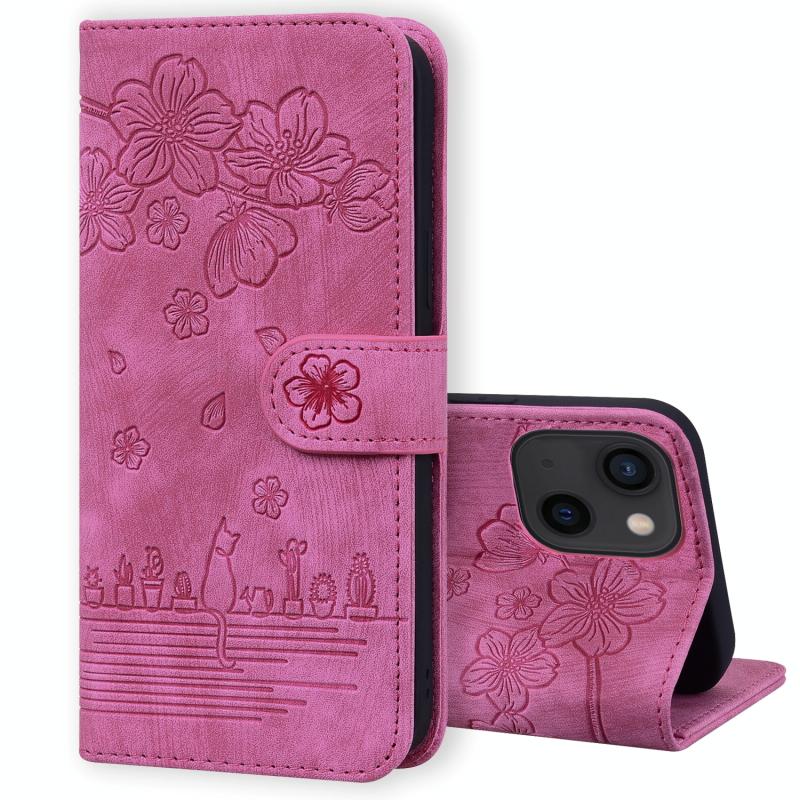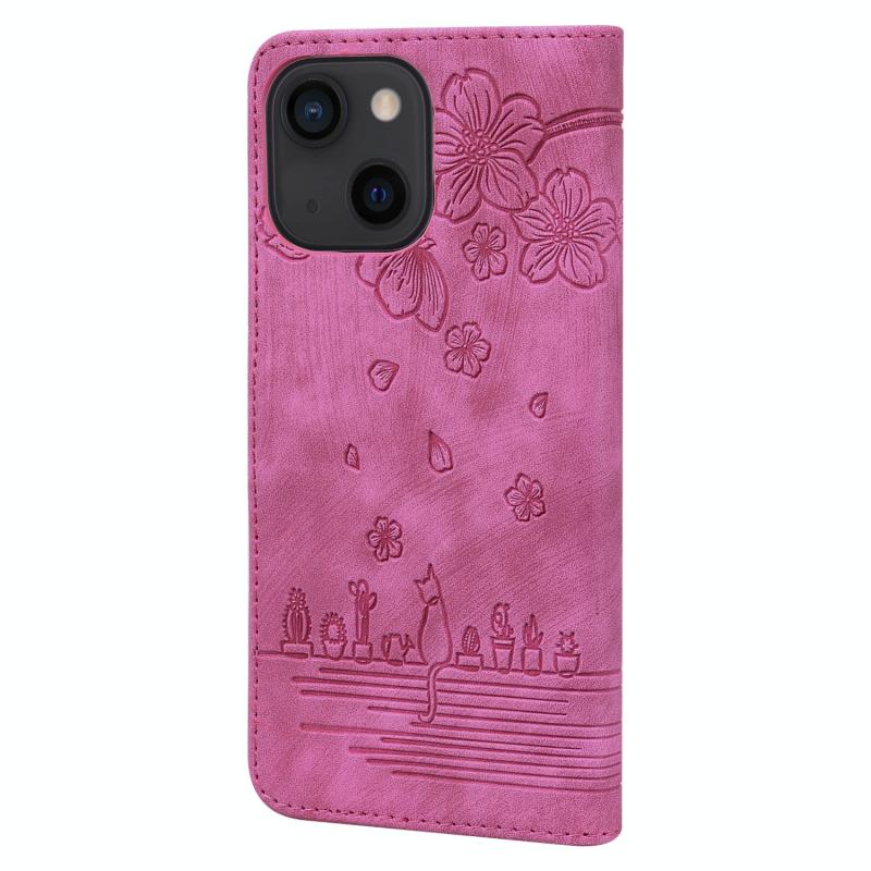 Θήκη Δερμάτινη με Χαριτωμένη Γάτα και Άνθη για iPhone 13 mini (Ροζ Κόκκινο)