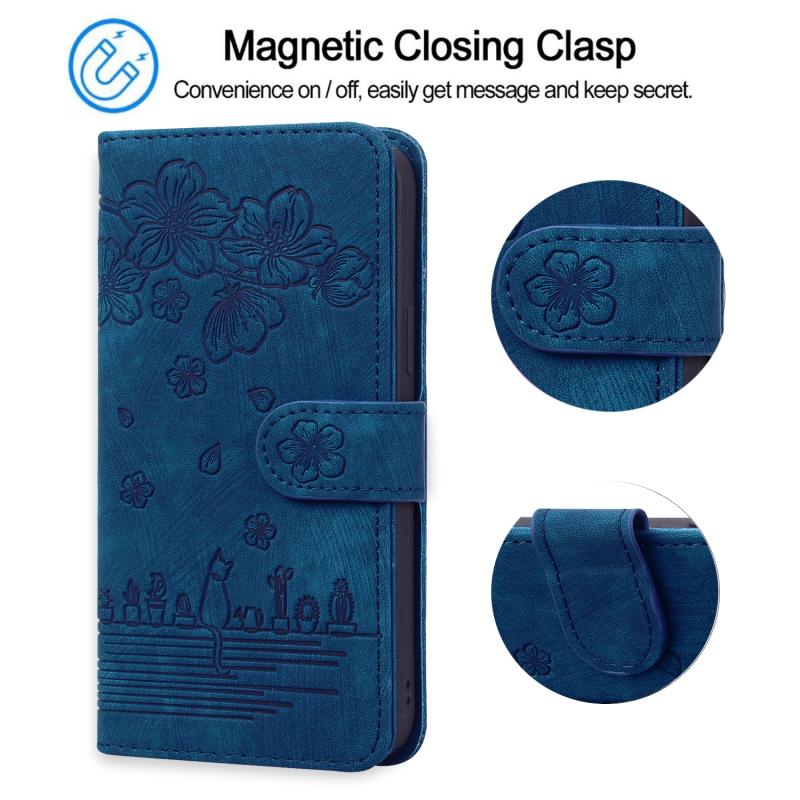 Θήκη Δερμάτινη με Χαριτωμένη Γάτα και Άνθη για iPhone 13 mini (Ρουά Μπλε)