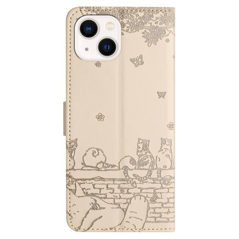 For iPhone 13 mini Cat Embossing Pattern Leather Phone Case with Lanyard(Beige)