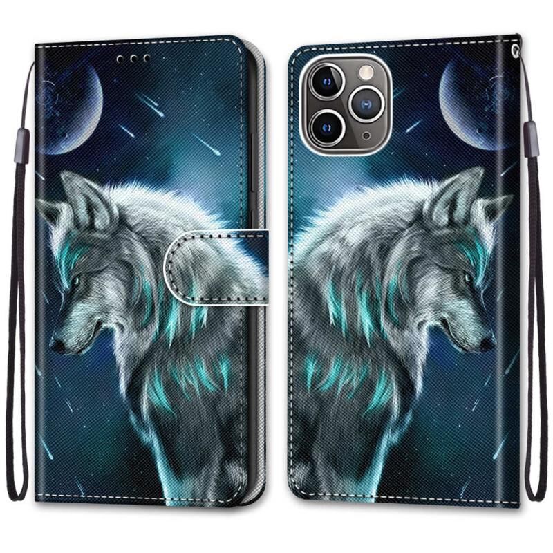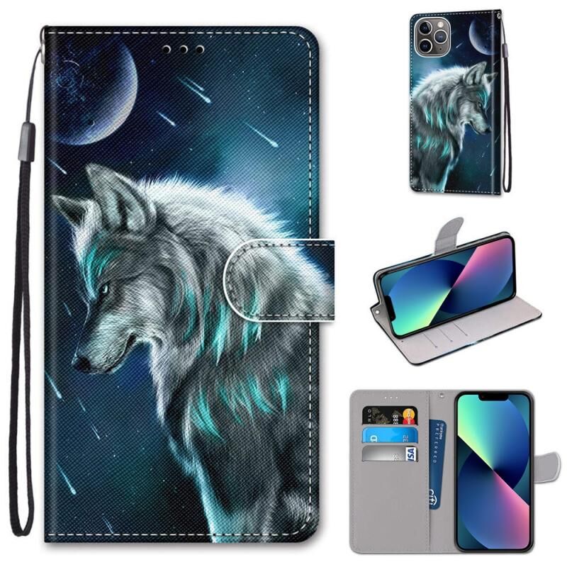 Θήκη για iPhone 13 mini με πολύχρωμο σχέδιο, υφή σταυρού, οριζόντια αναδίπλωση από δερματίνη PU με βάση & θήκες για κάρτες & πορτοφόλι & κορδόνι (Στοχαστικός Λύκος)