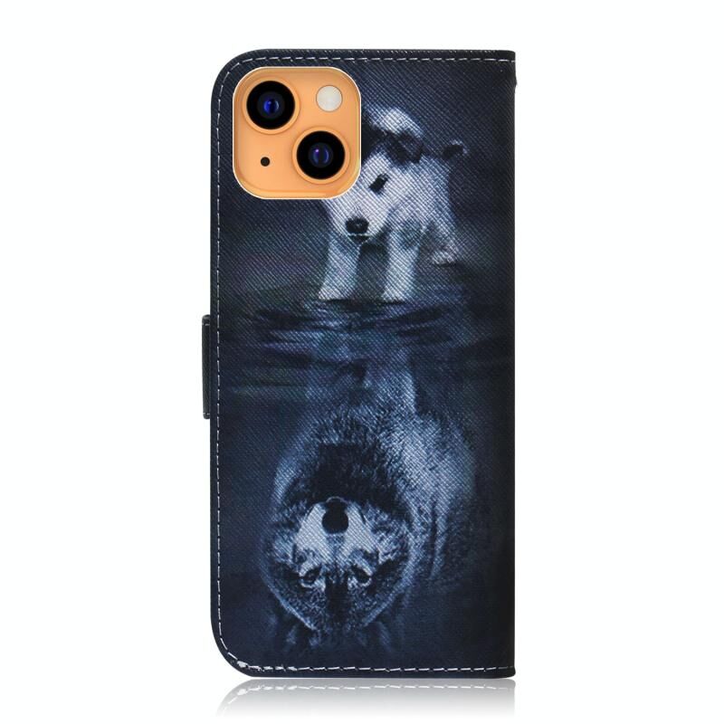 Θήκη δέρματος οριζόντιας αναδίπλωσης με σχέδιο για iPhone 13 mini (Λύκος και Σκύλος), με βάση, θήκες καρτών και πορτοφόλι.